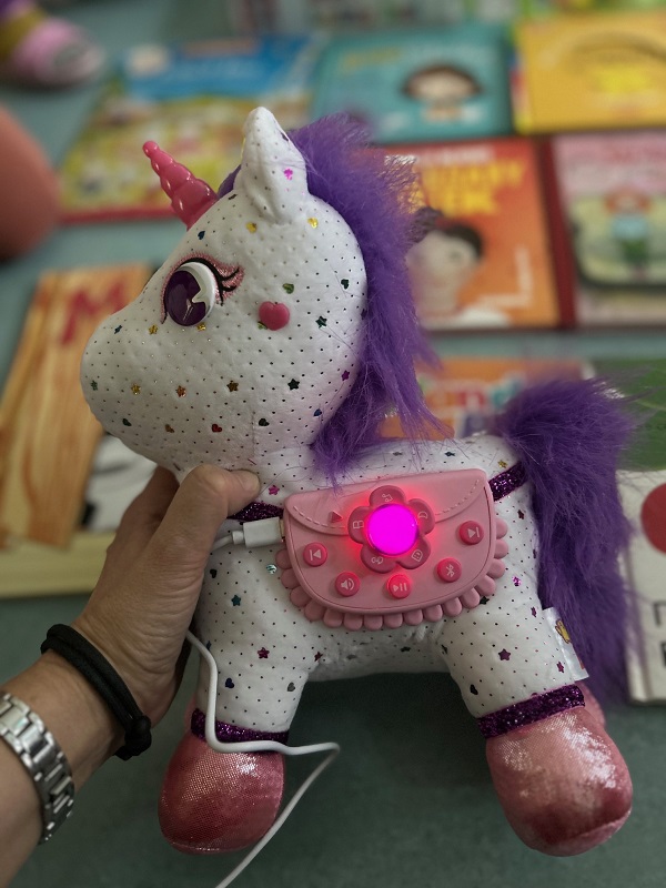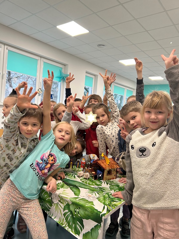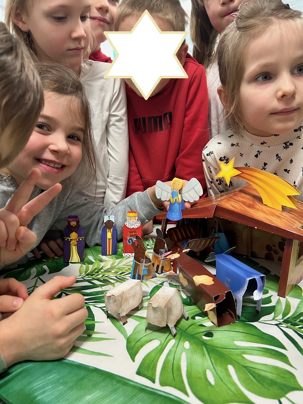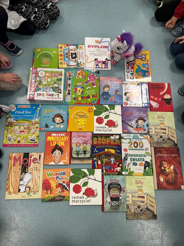 Nagrodą w konkursie było ponad 20 wspaniałych książek,  gra planszowa, interaktywny jednorożec opowiadający bajki i rymowanki oraz piękna papierowa szopka, którą dzieci od razu z entuzjazmem złożyły – radości było co niemiara!