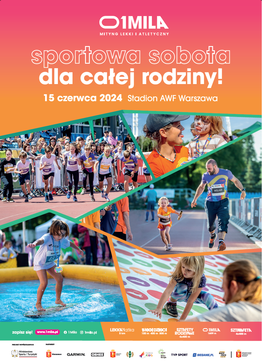 Serdecznie zapraszamy do udziału w wyjątkowym wydarzeniu sportowym- Sportowa sobota dla całej rodziny z 1MILĄ! Mityng „1MILA” to całodzienne wydarzenie sportowe, gdzie bieganie przeplata się z zabawą! Do wyboru jest aż 5