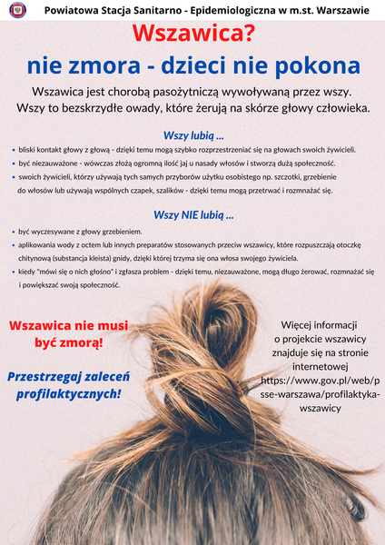 Szanowni Państwo, Państwowy Powiatowy Inspektor Sanitarny w m.st. Warszawie w ramach akcji profilaktycznej dotyczącej wszawicy "Samo umycie włosów nie wystarczy" przekazuje materiały edukacyjne z zakresu profilaktyki wszawicy. Z uwagi na wciąż aktualny